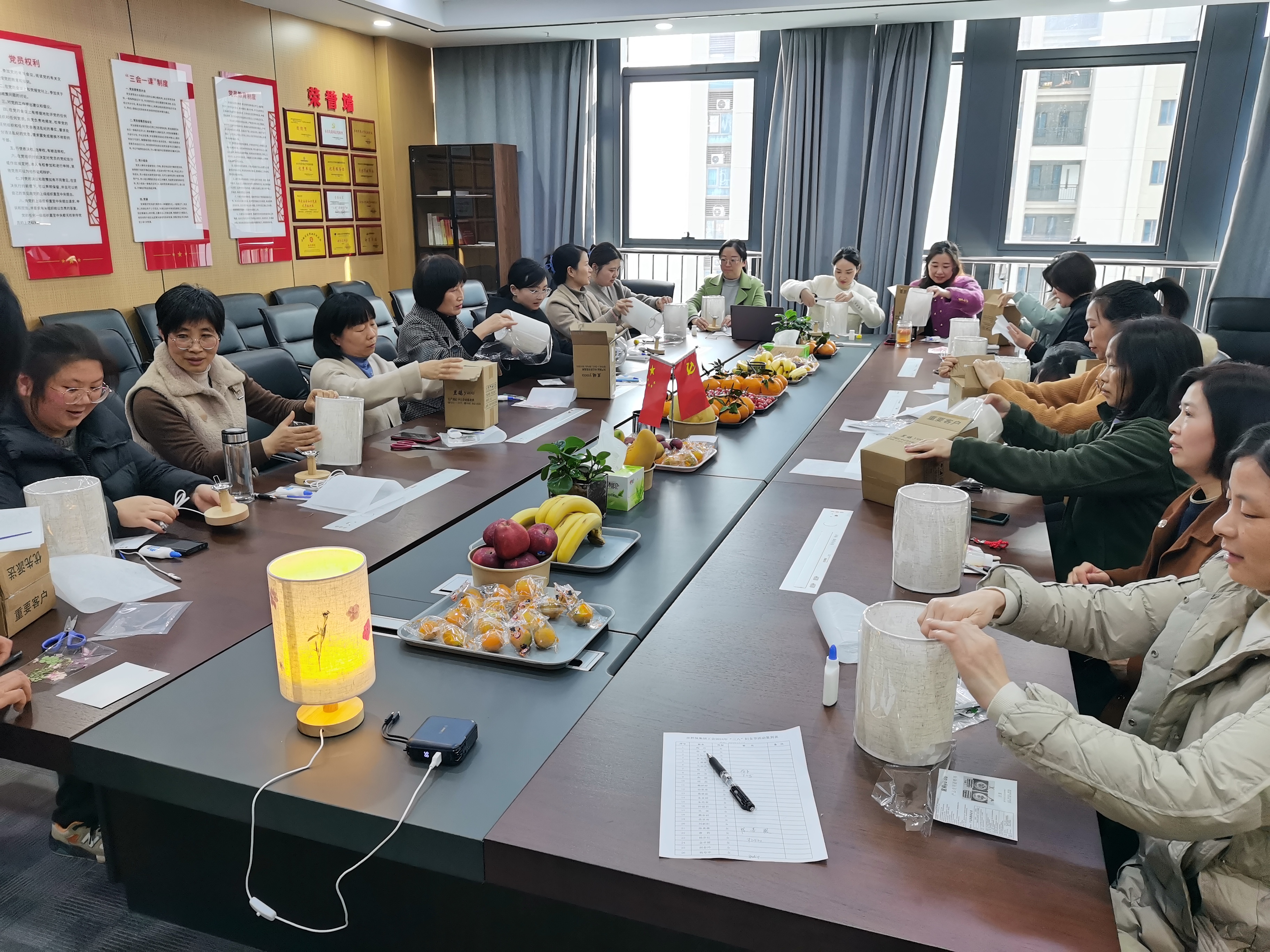 一是開展手工趣味活動。邀請工會女工委員代表為大家指導(dǎo)壓花臺燈的設(shè)計和制作過程,在選花、構(gòu)思、涂膠方面給予詳細(xì)指導(dǎo)。女職工們邊聽邊學(xué)邊動手,不斷討論、互相交流制作心得,分享自己的手工作品,并與作品合影留念?;顒蝇F(xiàn)場歡聲笑語不斷,其樂融融。