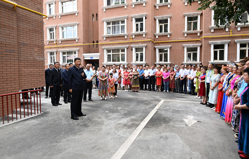 7月12日至15日,中共中央總書記、國家主席、中央軍委主席習近平在新疆考察。這是13日上午,習近平在烏魯木齊市天山區(qū)固原巷社區(qū)考察時,同各族群眾在一起。新華社記者 謝環(huán)馳 攝
